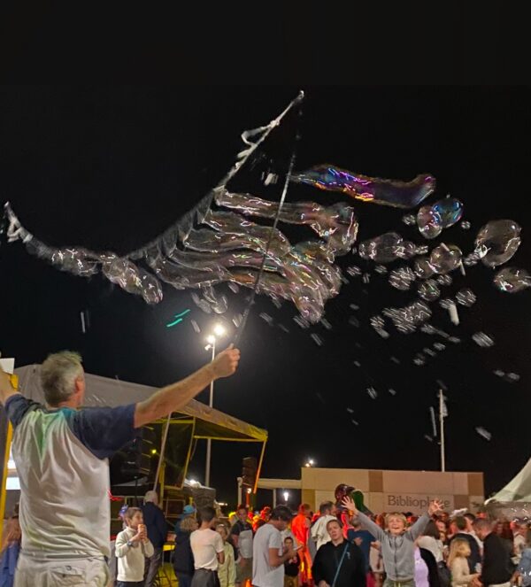 « Des bulles de savon… des souvenirs d’enfance, une notion de légèreté et fragilité, un art éphémère, tous publics, une invitation aux rêves poétique »