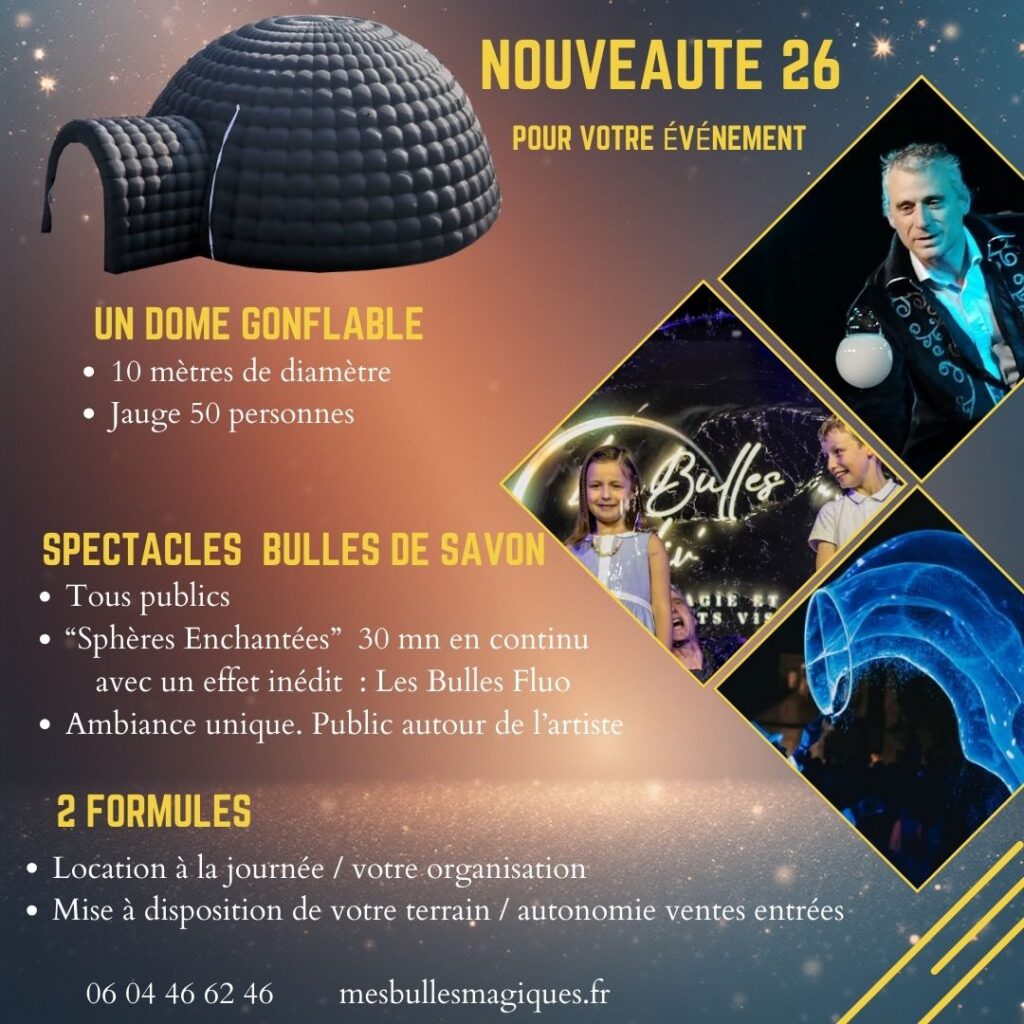Le Dôme Et si votre événement prenait une toute nouvelle dimension… Imaginez une structure gonflable spectaculaire, 10 mètres de diamètre, 5 mètres de hauteur, un véritable cocon immersif Idéal pour créer un nouvel espace sur votre lieu d’événement Un lieu unique, chaleureux et surprenant, pouvant accueillir jusqu’à 50 personnes. Une nouveauté exclusive des Bulles d’Oliv’. 📸 Photos et vidéos à venir 👉 Restez connectés… 2026 s’annonce magique Concept unique